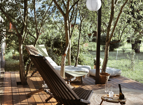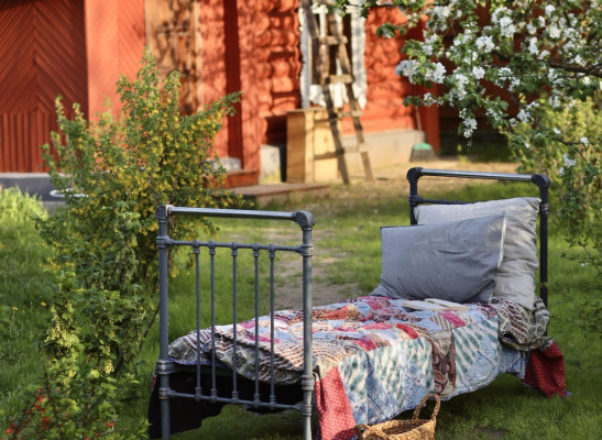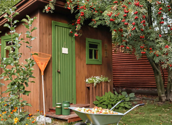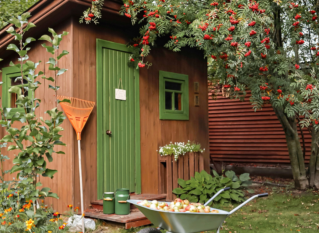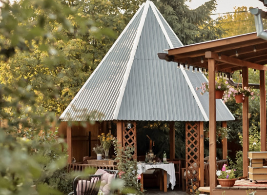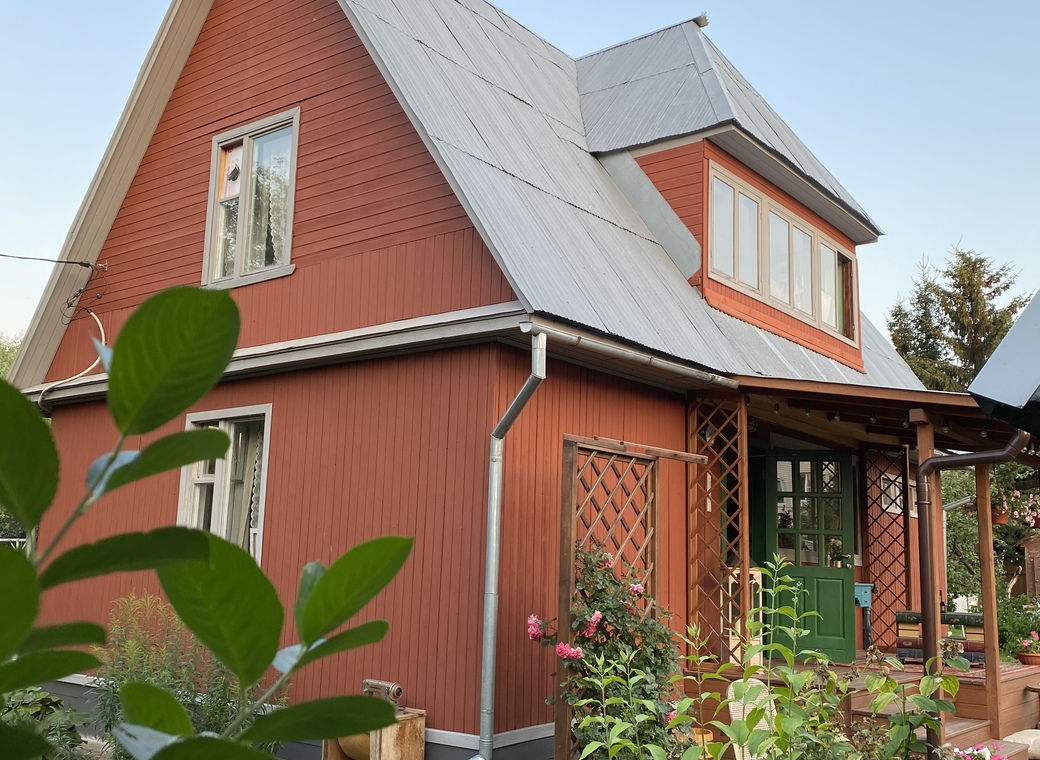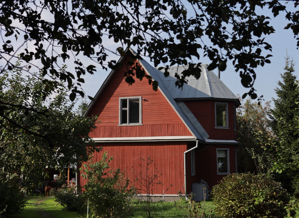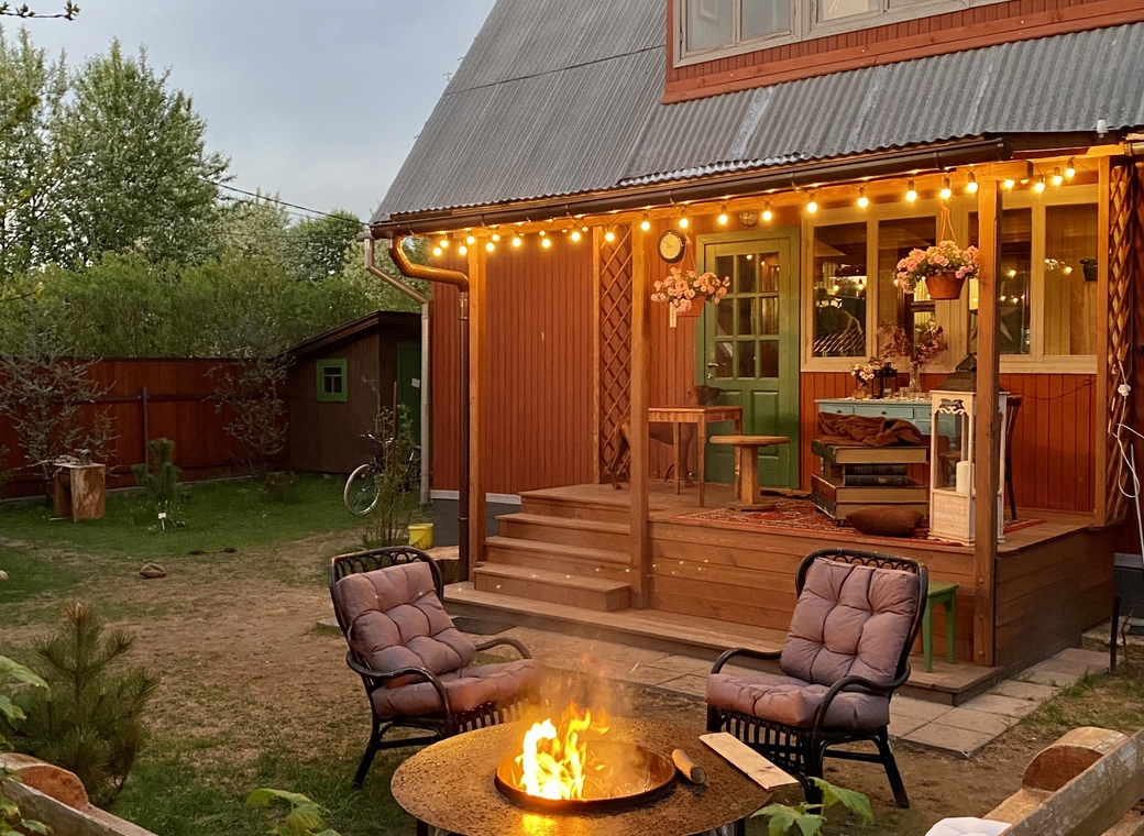 На участке: баня, беседка, сарай, мастерская, теплица, зона с очагом, сад.