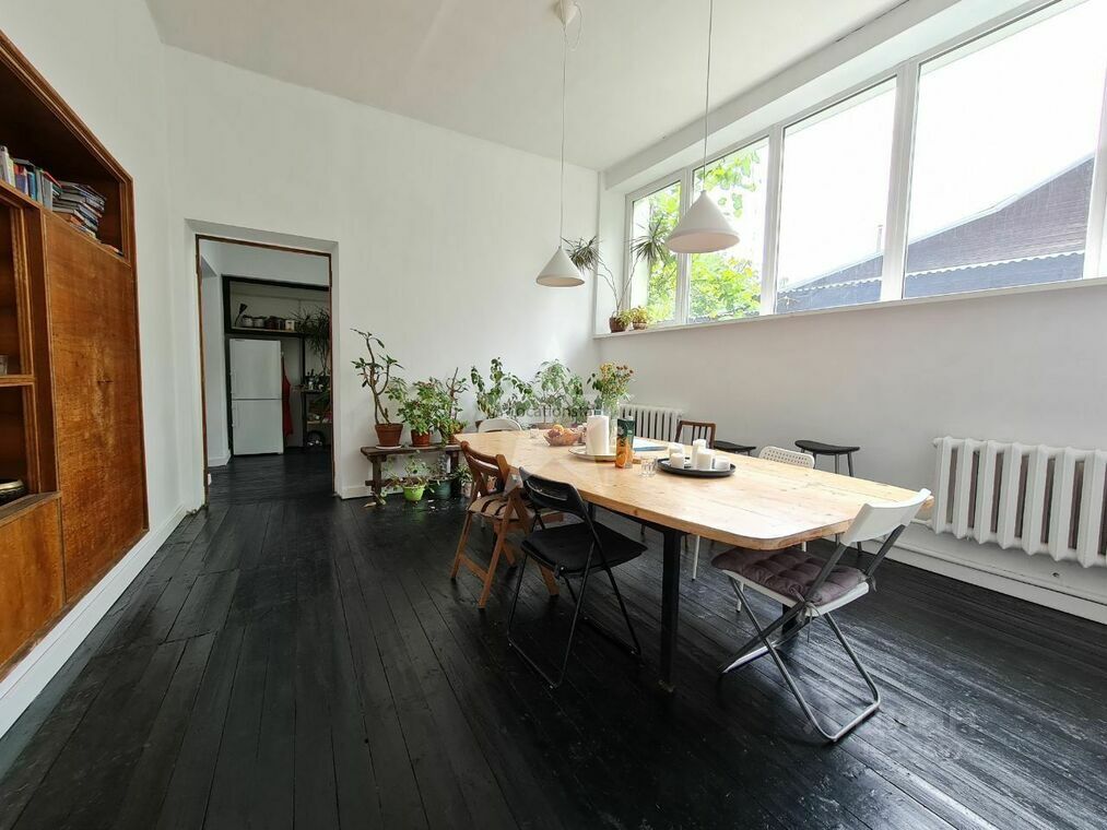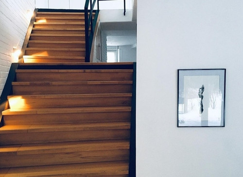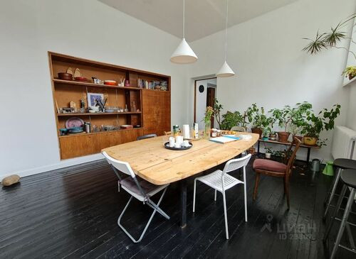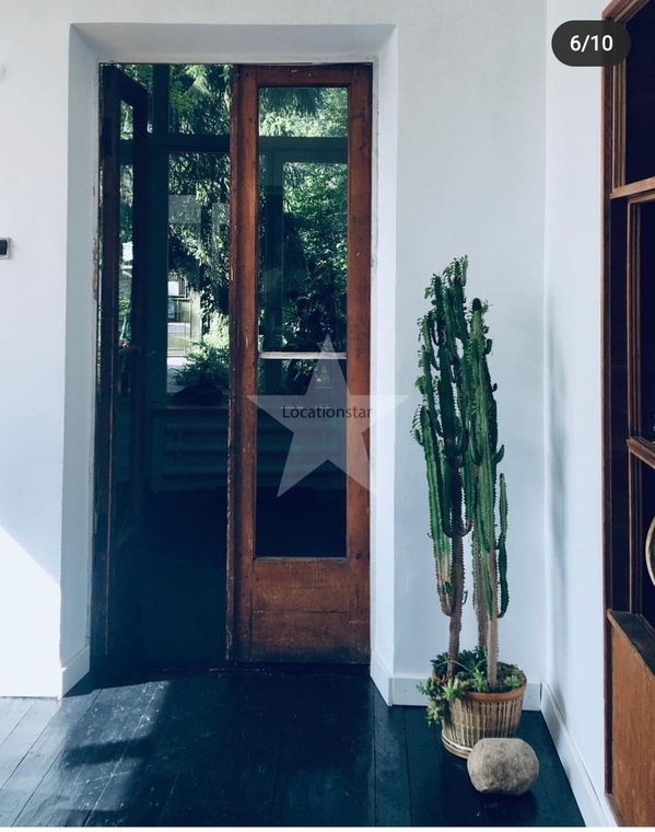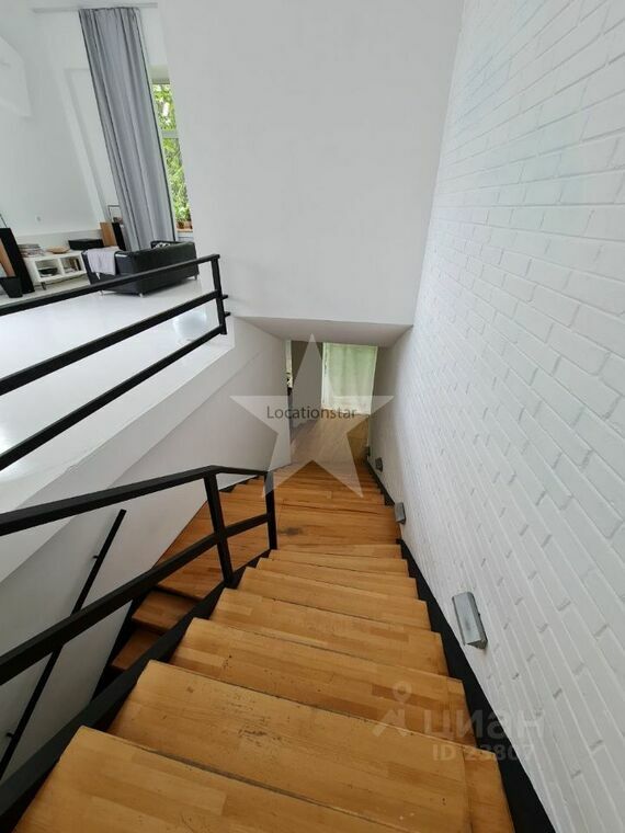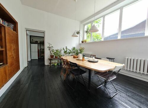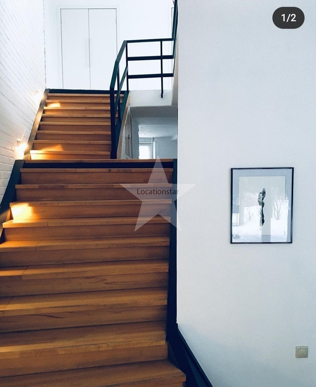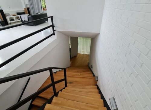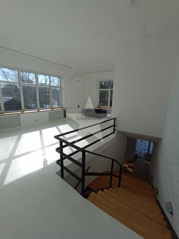 Дом конструктивистской архитектуры с четырехметровыми потолками и большими окнами. Отделка под минималистический лофт. Много света в каждом помещении. Широкая деревянная лестница на второй этаж, который используется как выставочное пространство. Также наверху находятся три спальни. Самая большая имеет балкон 12 м2, выходящий на тихий, заросший деревьями участок.