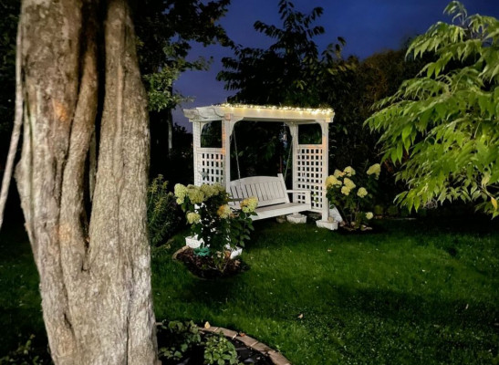 При входе на участок кованая арка оплетенная деревом - эффектно смотрится летом.