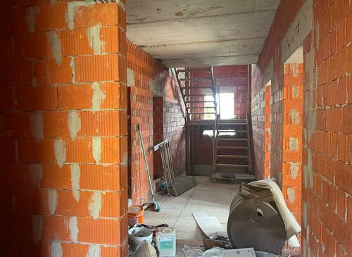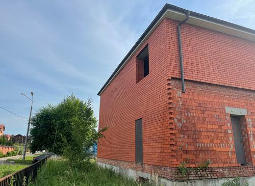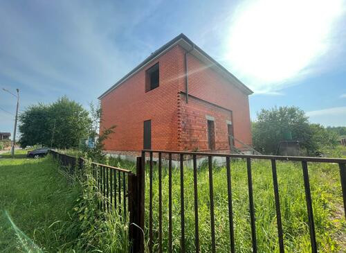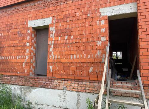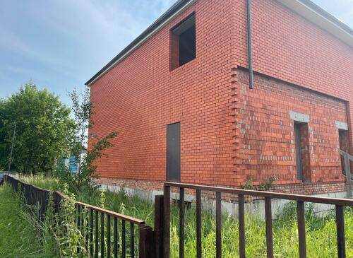 Недостроенный кирпичный домик, в благоустроенном коттеджном посёлке.