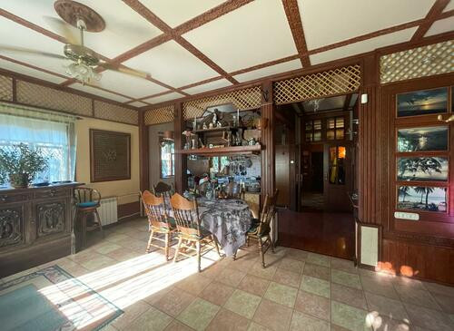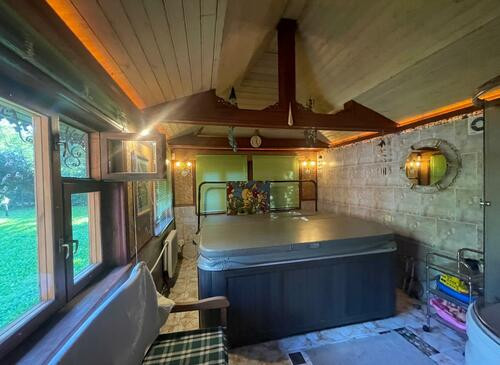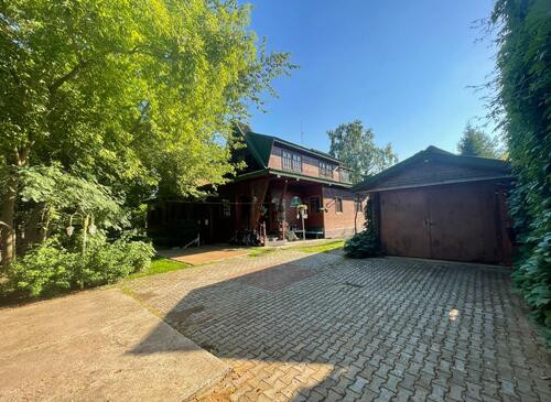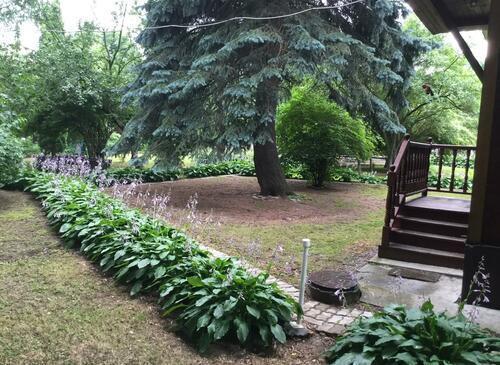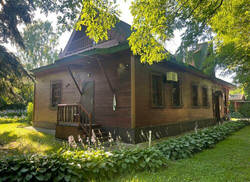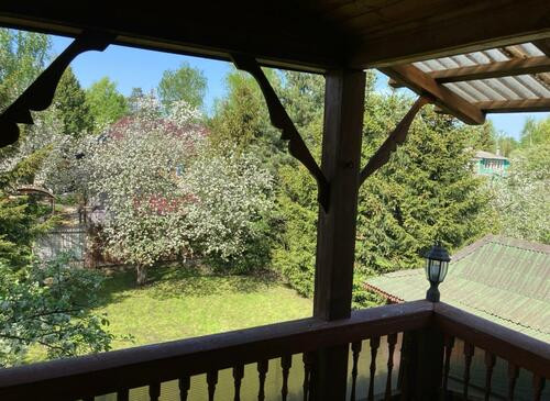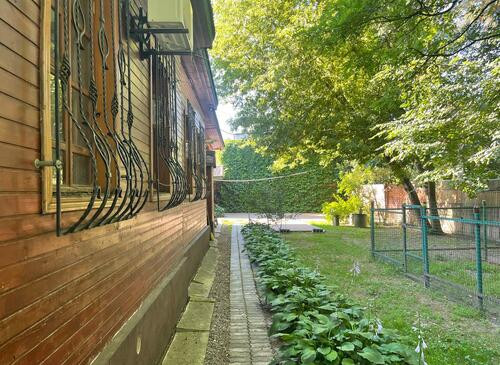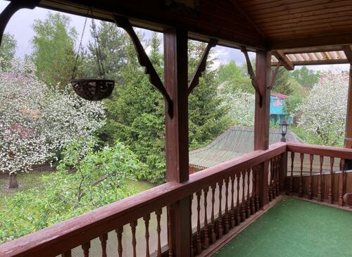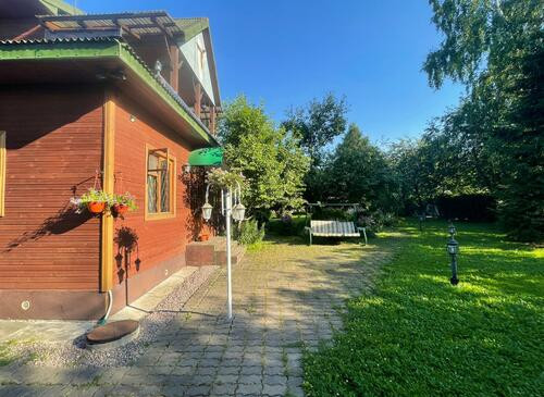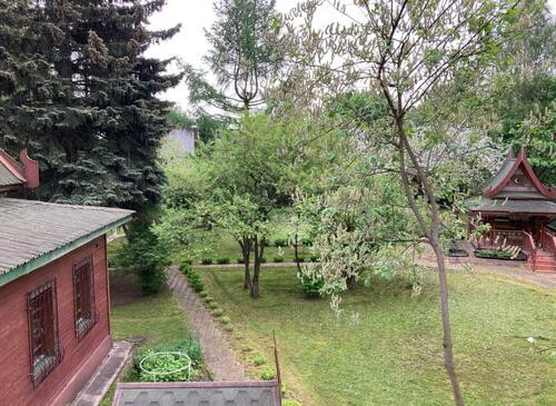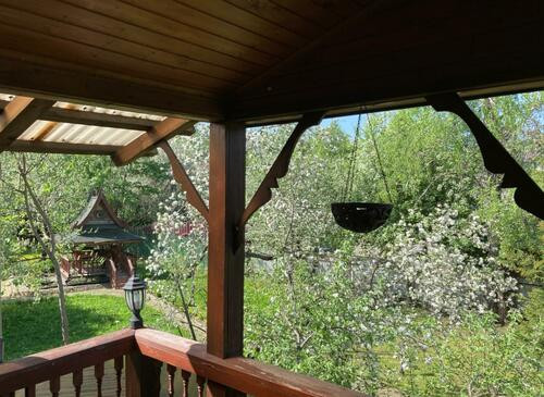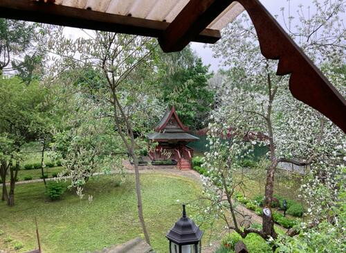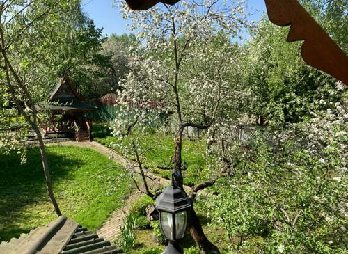 Ухоженная придомовая территория с китайскими беседками, многочисленными деревьями и колодцем.