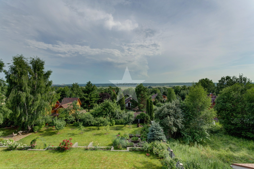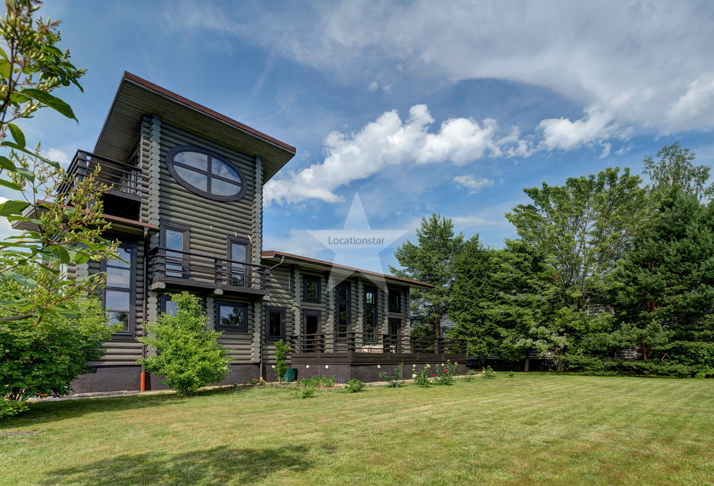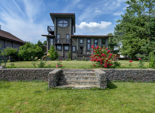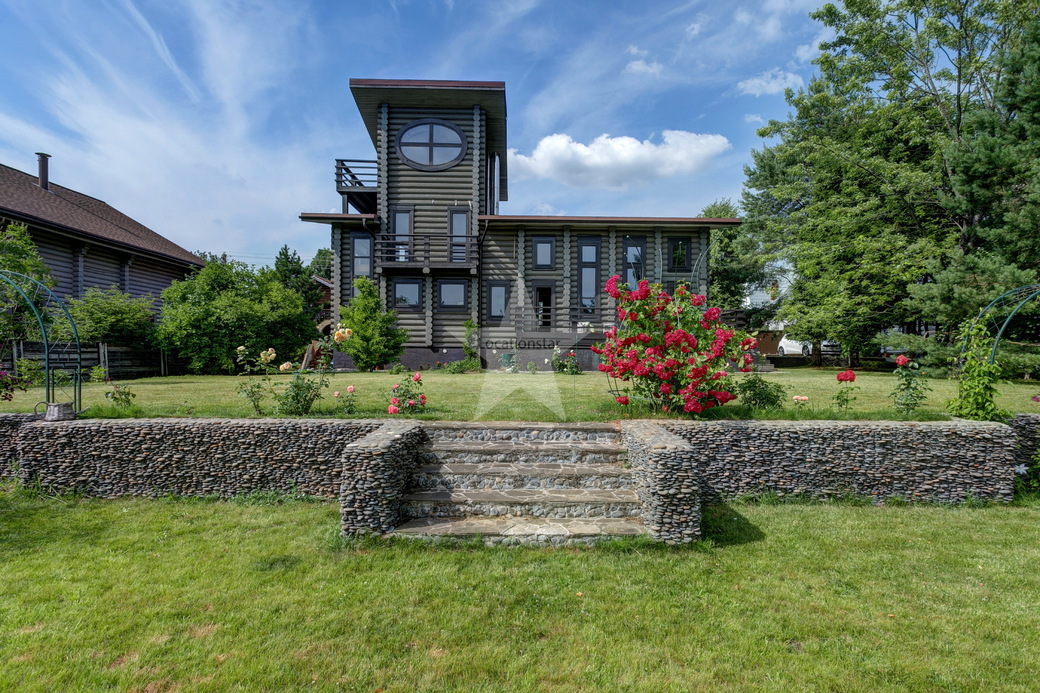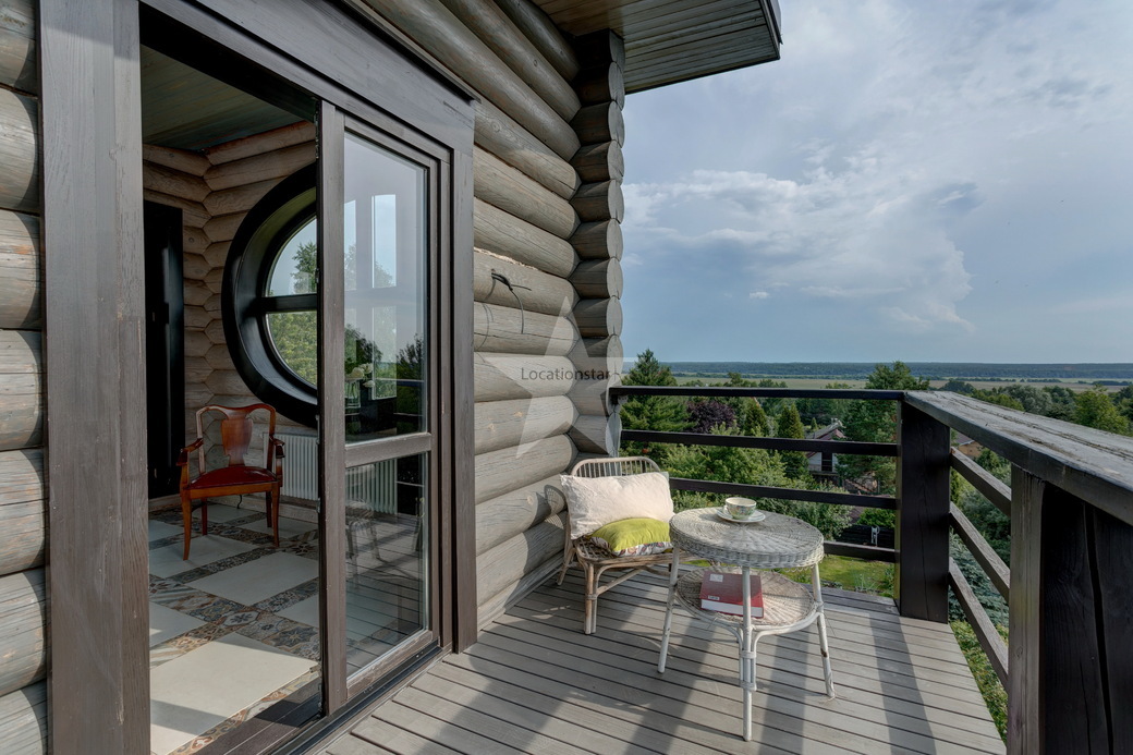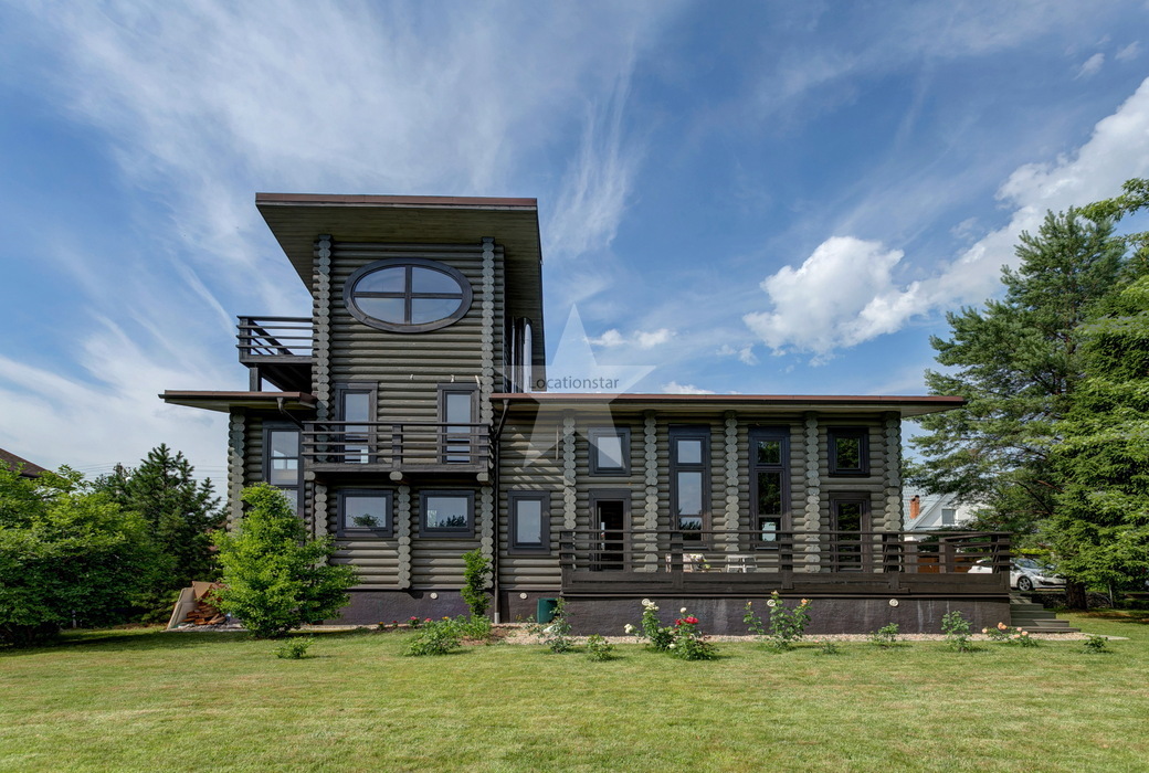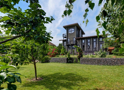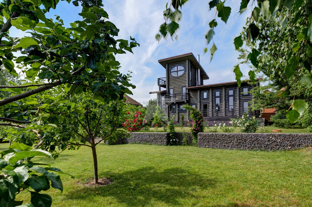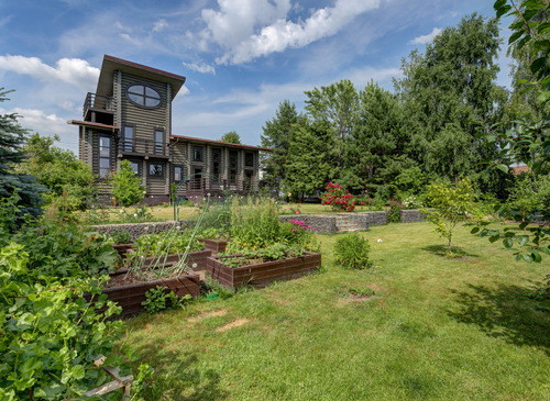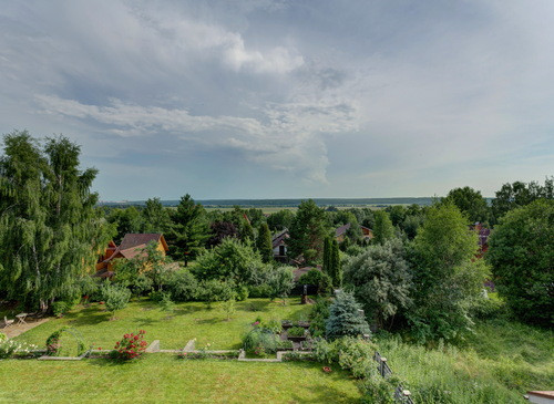 Трехэтажный деревянный дом в современном стиле с верандой, камином и большим садом. Со второго этажа внутренней часть дома можно наблюдать уютную гостиную первого этажа. С балконов открывается великолепный деревенский пейзаж с полями.Дом является гостевым, мебелью и предметами интерьера его можно наполнять под настроение и задачи (вашими, либо из основного дома. В наличии рояль и мн. другое)