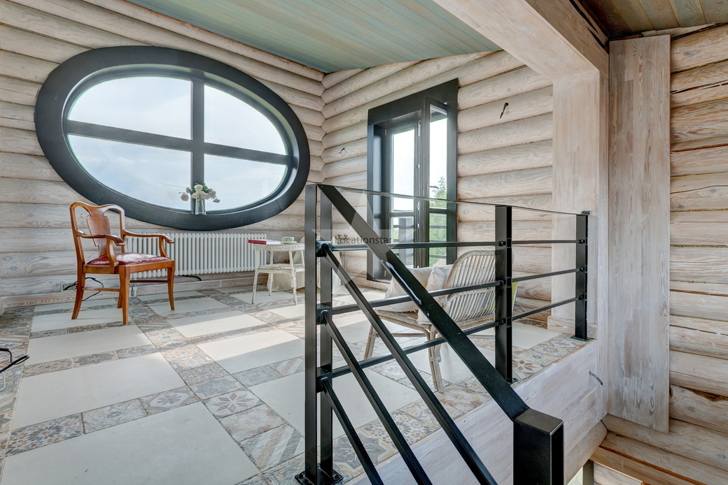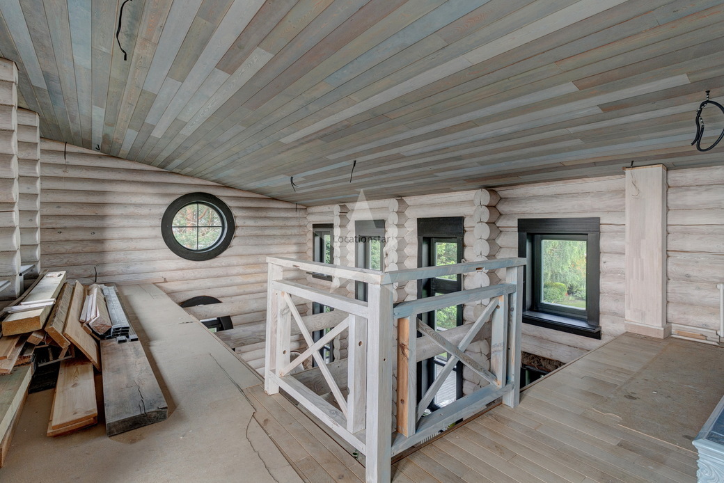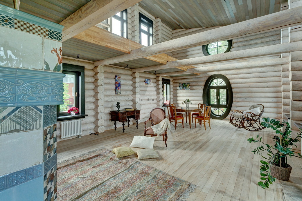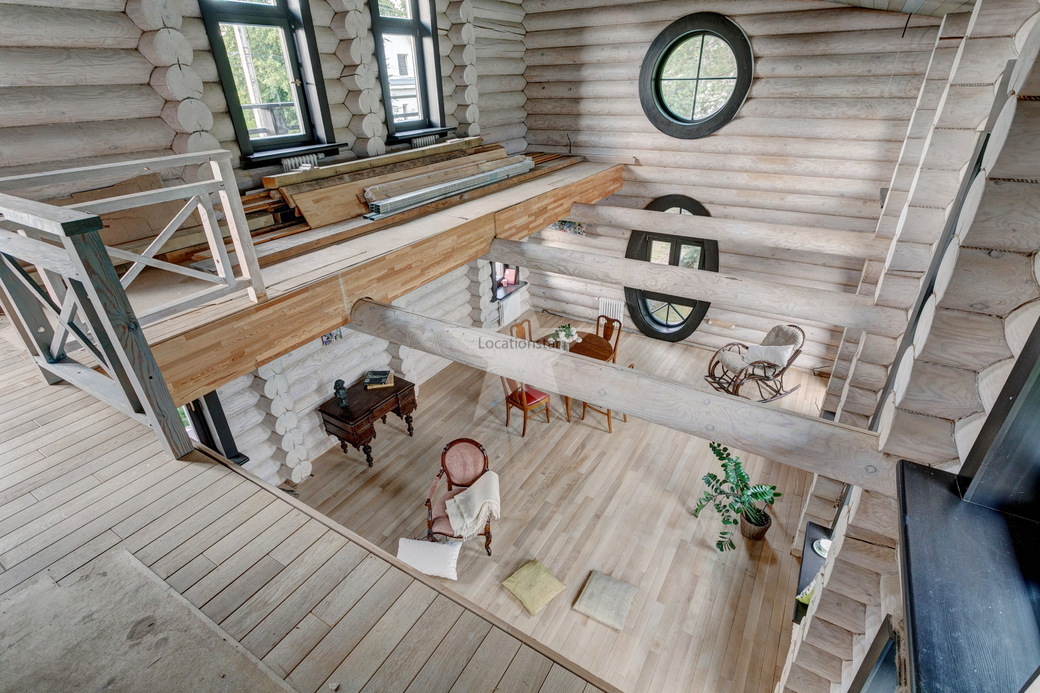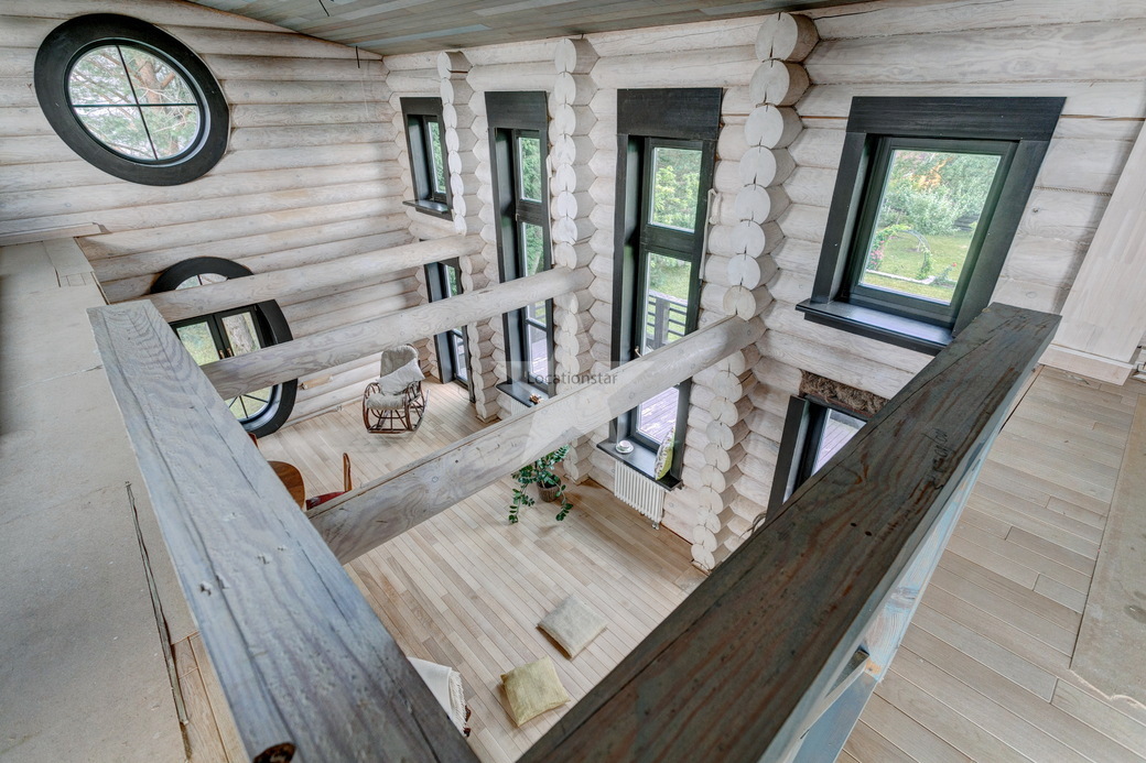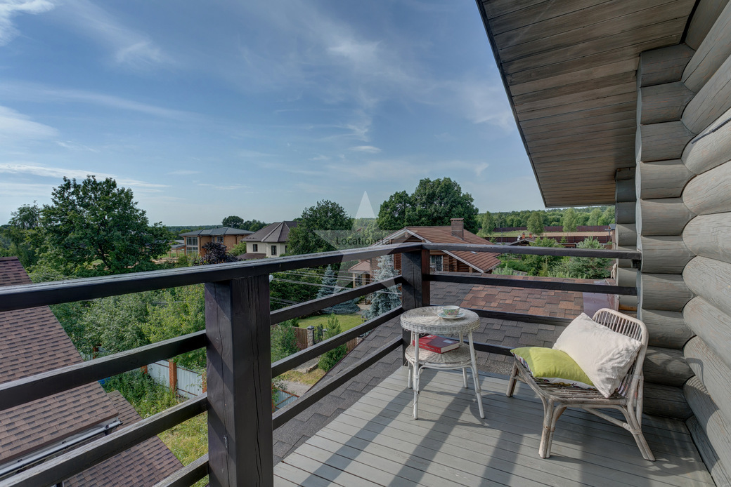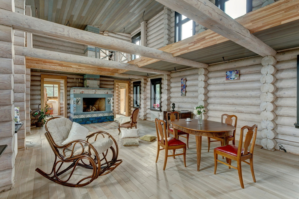 Трехэтажный деревянный дом в современном стиле с верандой, камином и большим садом. Со второго этажа внутренней часть дома можно наблюдать уютную гостиную первого этажа. С балконов открывается великолепный деревенский пейзаж с полями.Дом является гостевым, мебелью и предметами интерьера его можно наполнять под настроение и задачи (вашими, либо из основного дома. В наличии рояль и мн. другое)