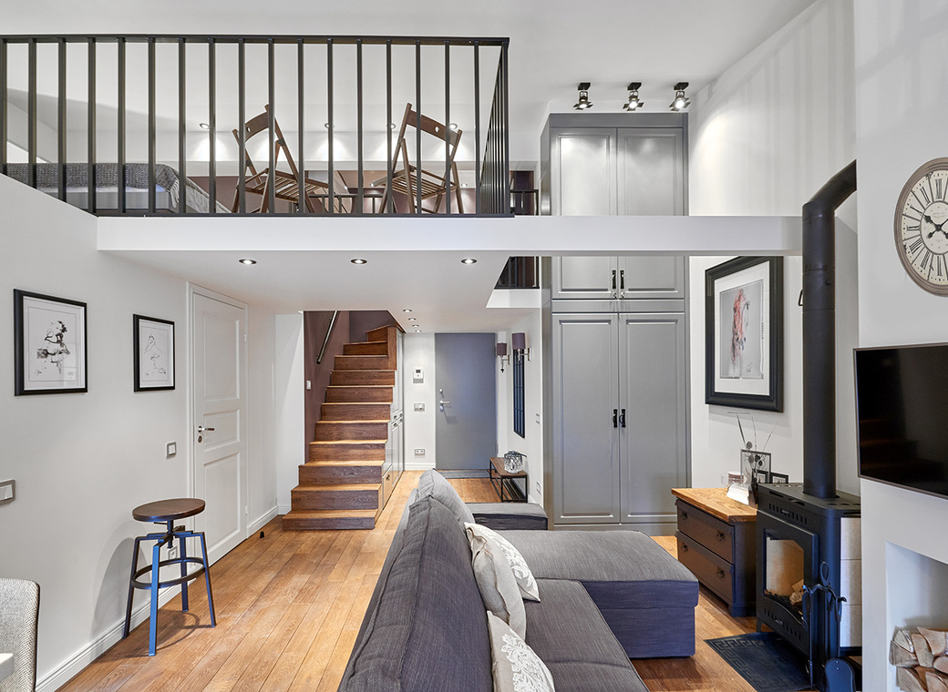 Апартаменты расположены в квартале клубных домов ЖК Парк Мира, 1-й этаж: гостиная с настоящей печкой-камином, полностью оборудованная кухня, 2-й этаж: спальня и рабочее место.