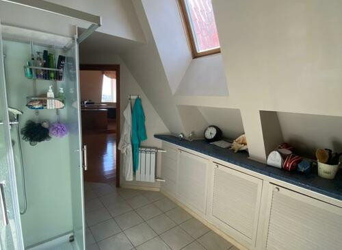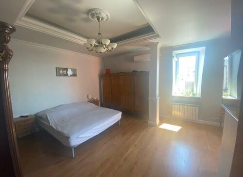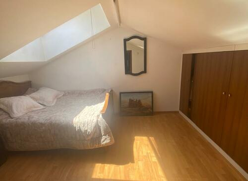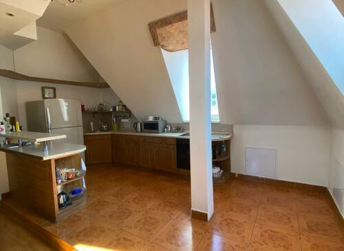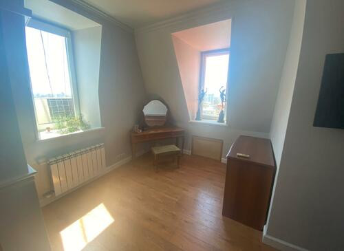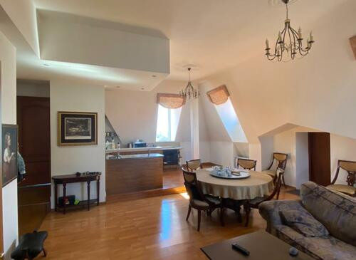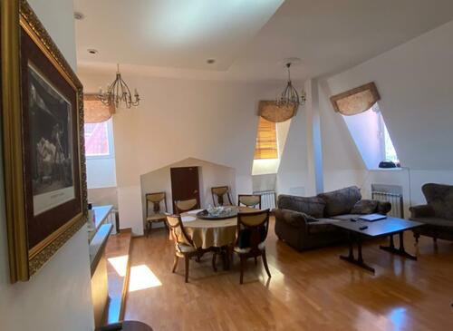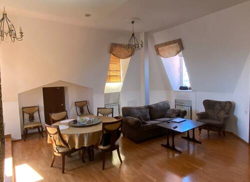 Просторная(100 кв.м), свежая, уютная, необычной планировки потому что размещается в мансардном этаже.