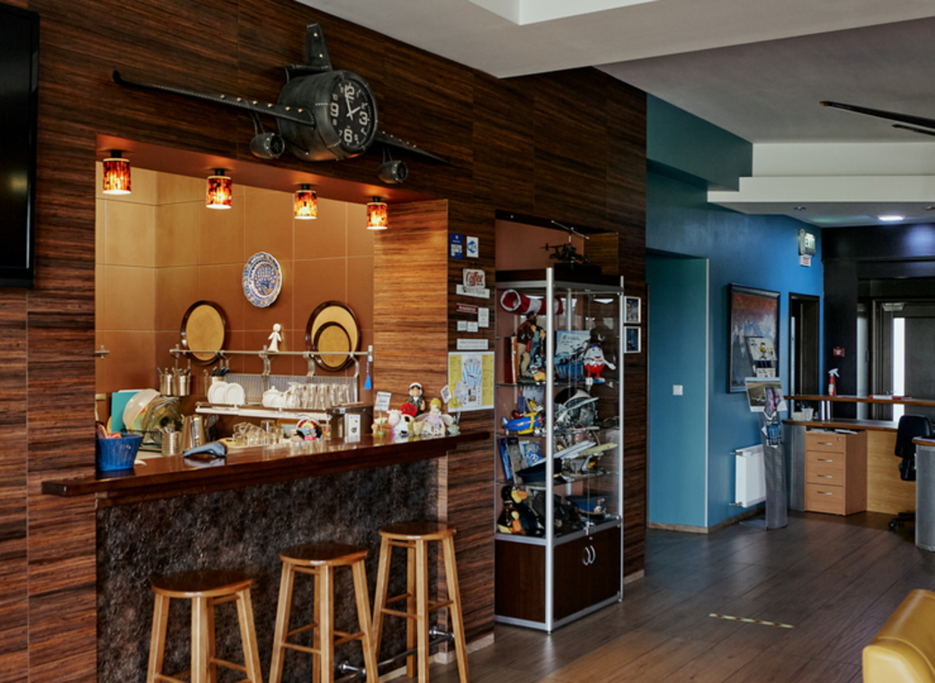 * Стилизованный аэроклуб – зона отдыха, где можно насладиться вкусным кофе, перекусить и подготовиться к съемке в гримерной комнате