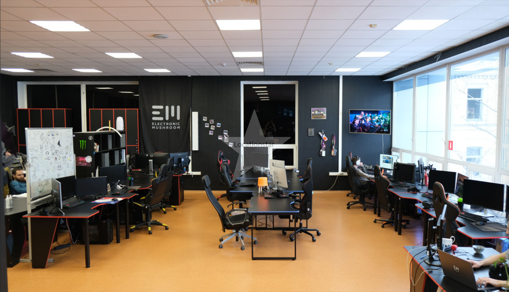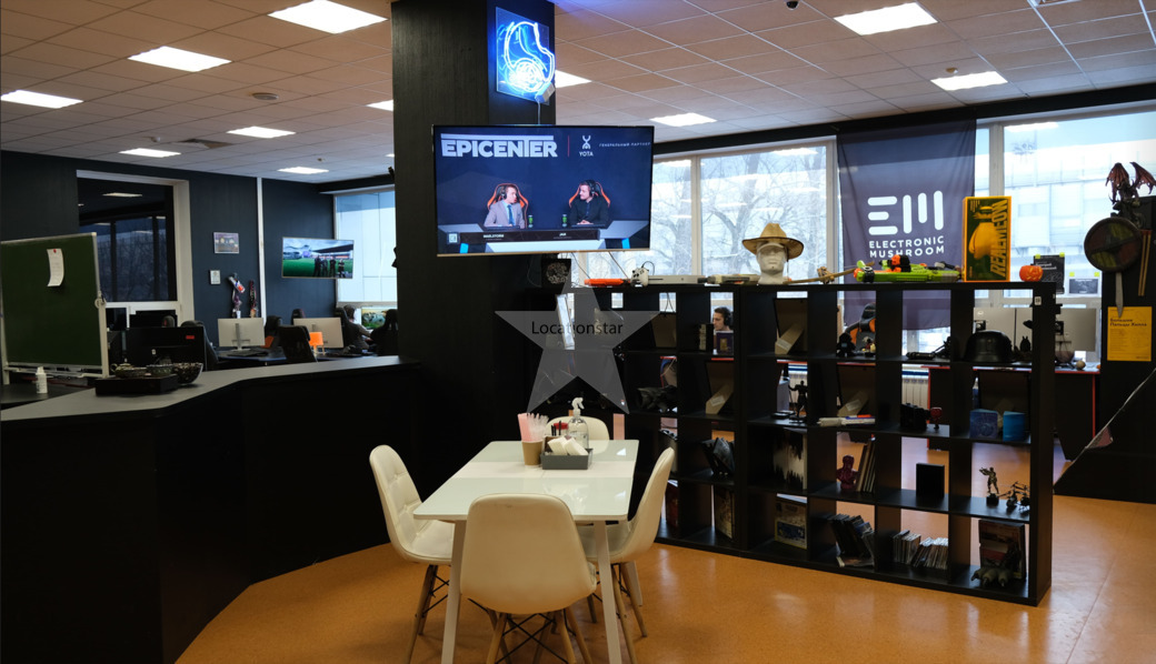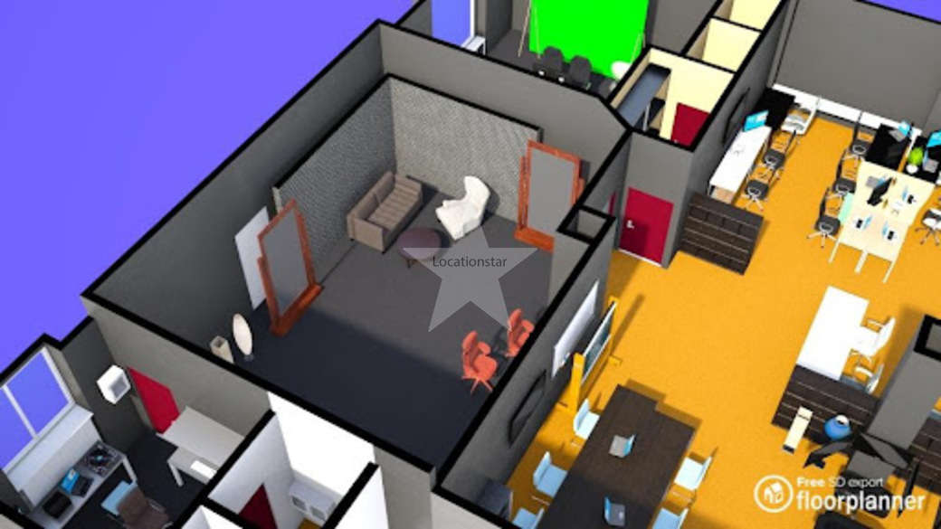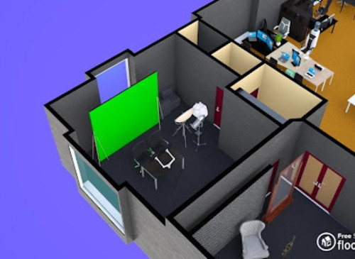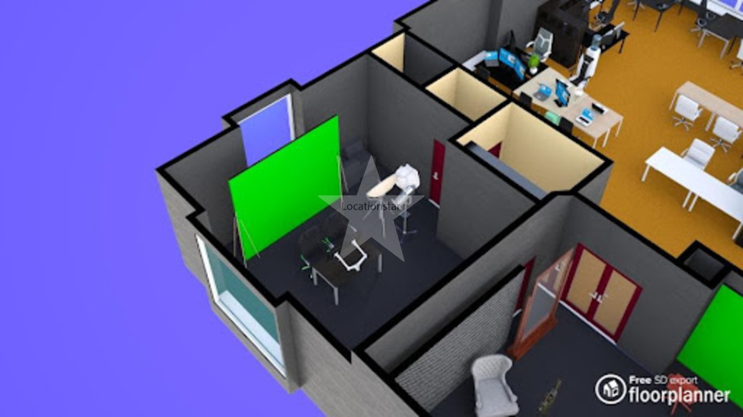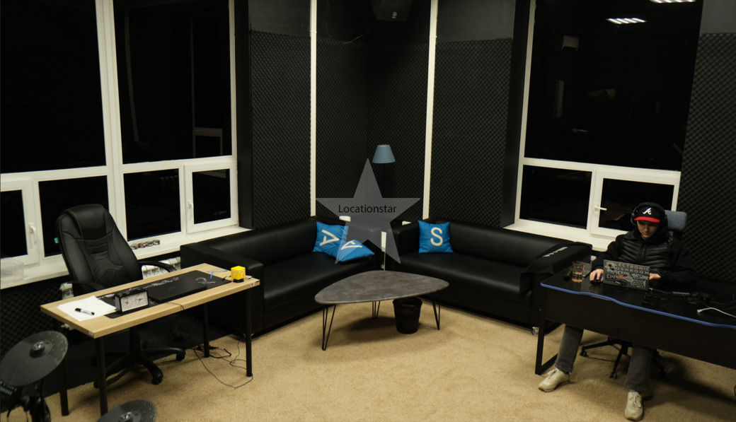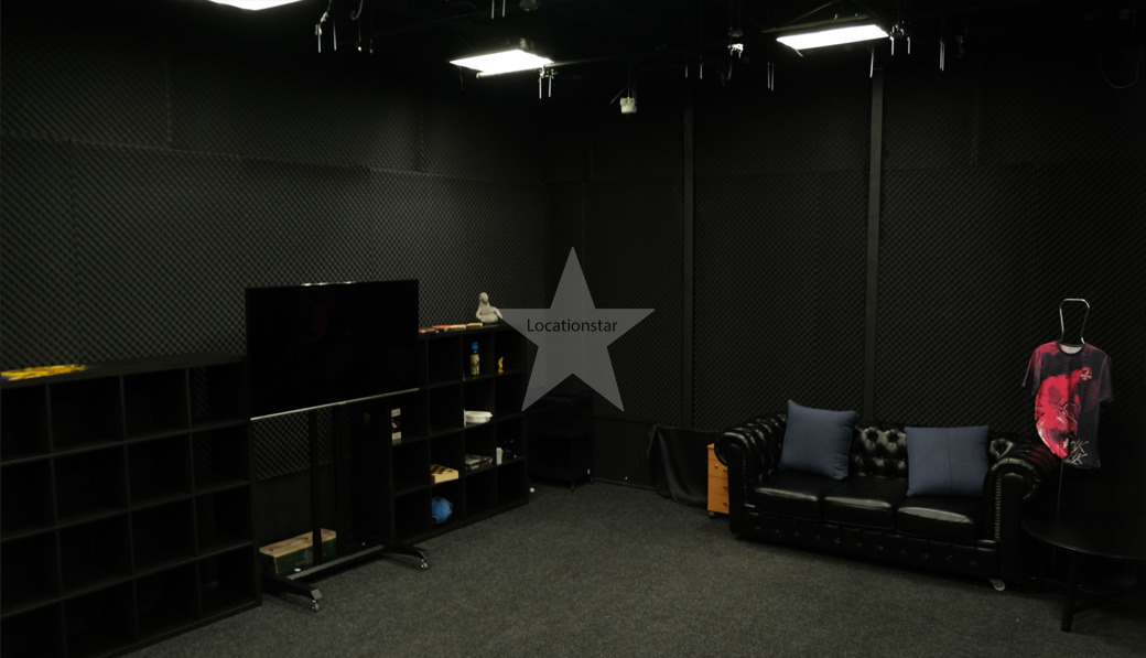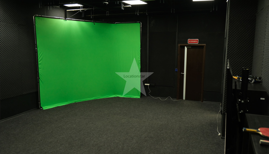 По 3-м стенам натянута зелёная ткань, которую можно заменить на черную. Стены отделаны шумоизоляцией. Помещение подойдет для эфиров малого формата: интервью, презентация, вебинар, комментаторская зона, let’s play и прочие.