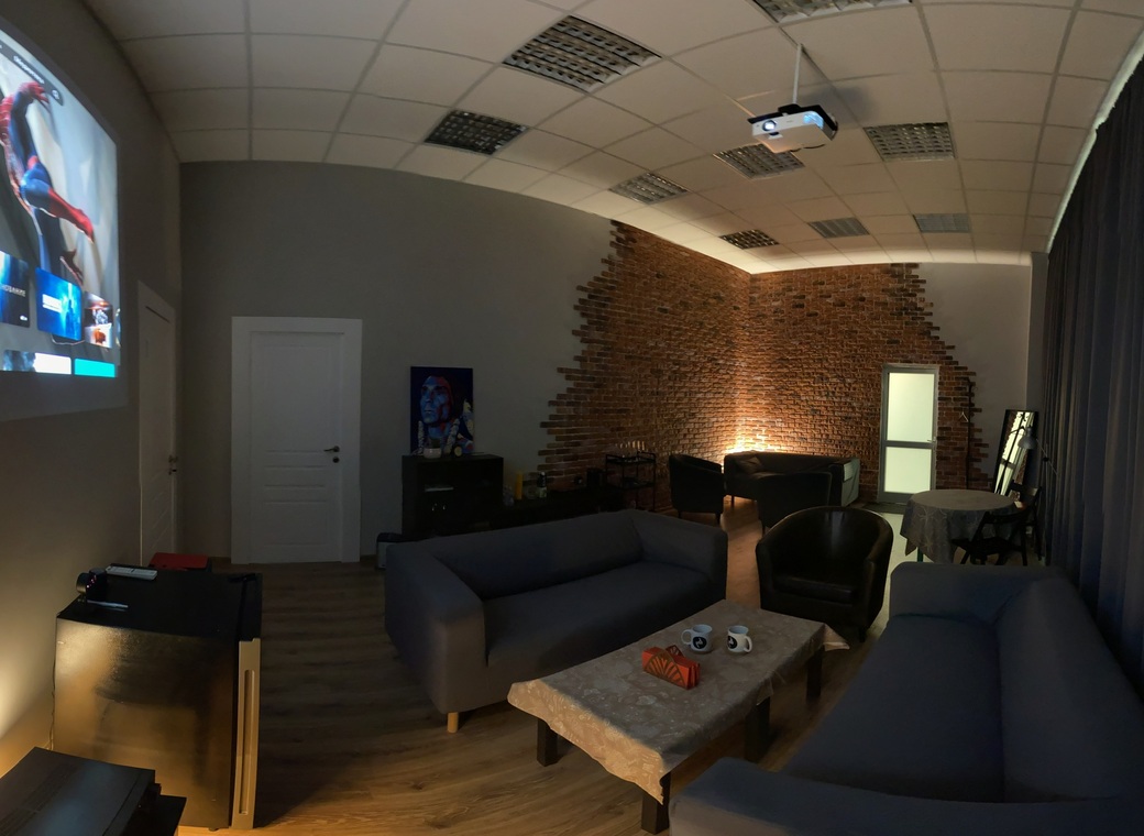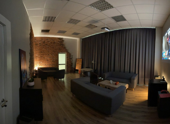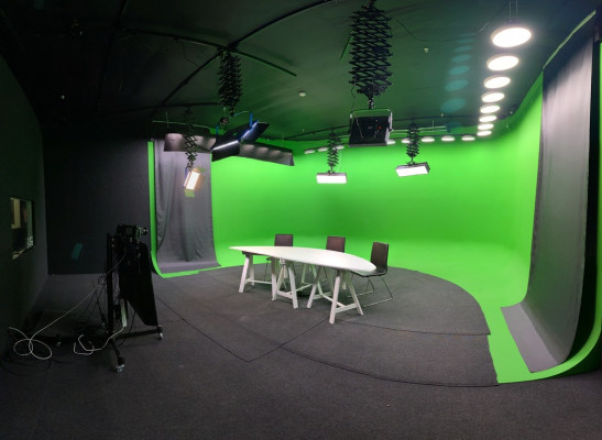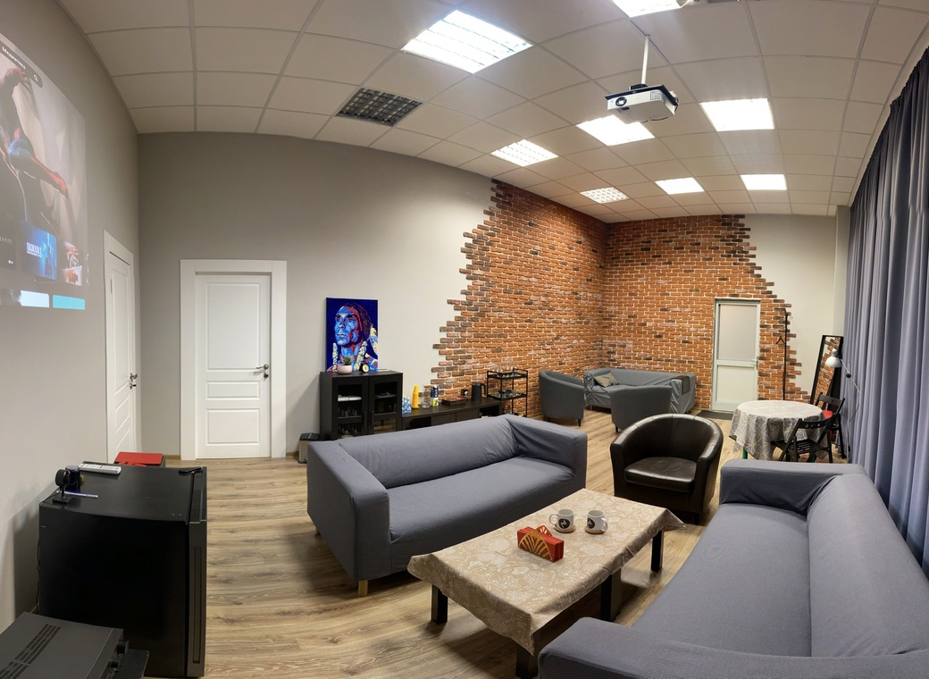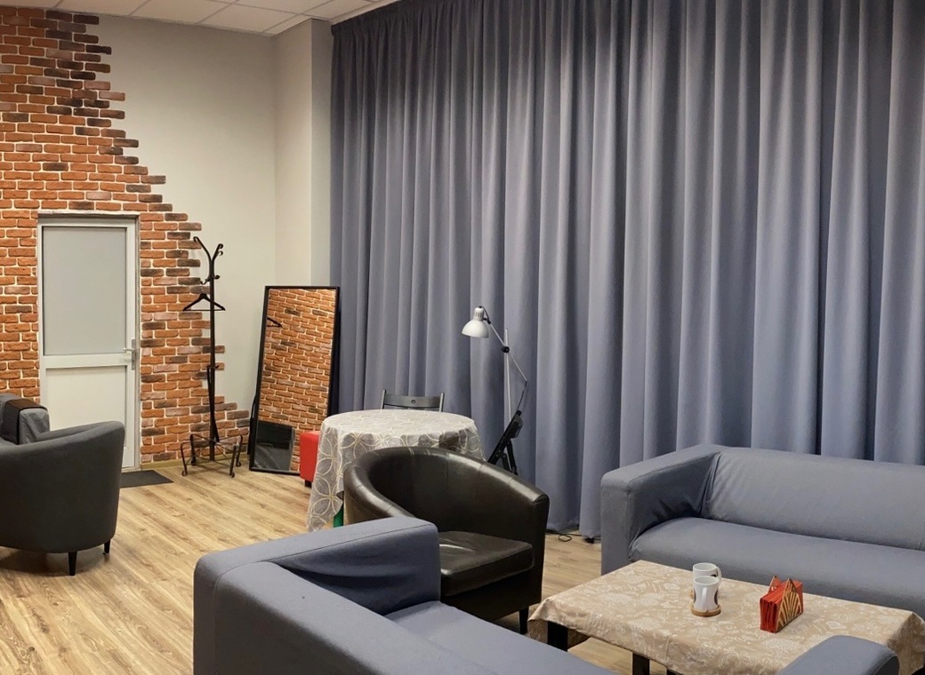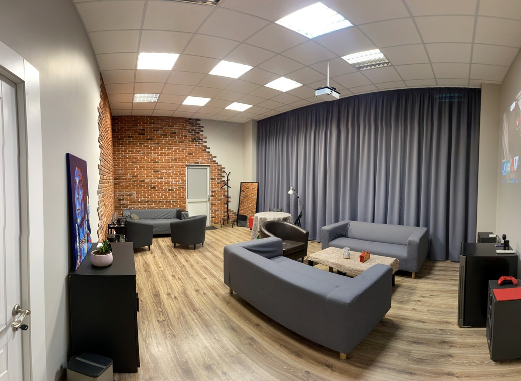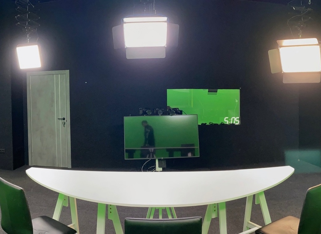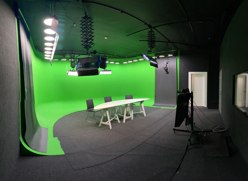 Комфортабельная ТВ-студия с циклорамой хромакей для онлайн-мероприятий и съемки видео.Большая гостевая зона