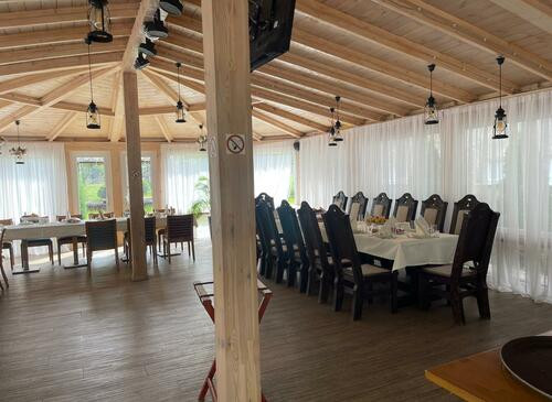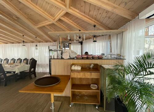 Уютный ресторан в светлых тонах на свежем воздухе, окружённый лесом ,отлично подходит для киносъёмок различной направленности.