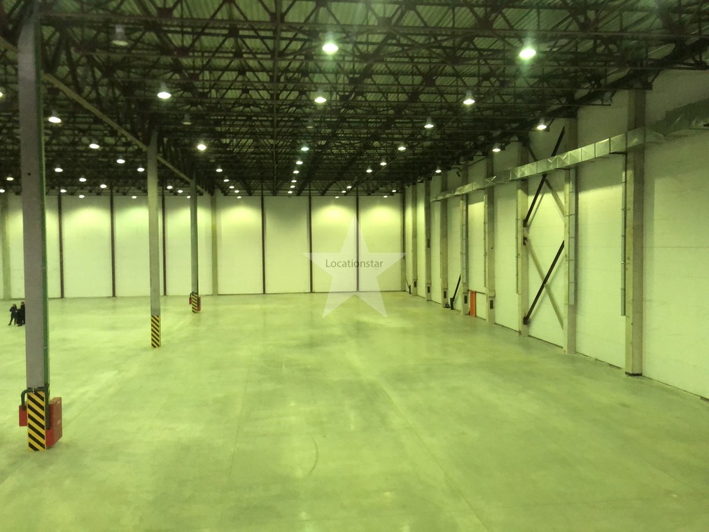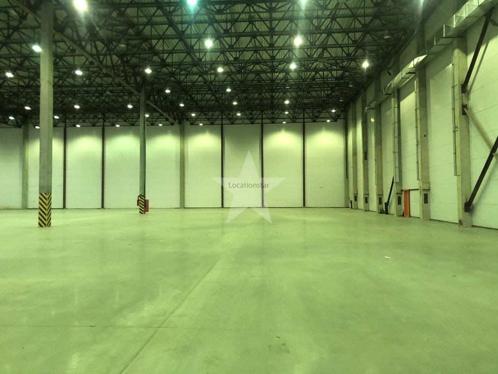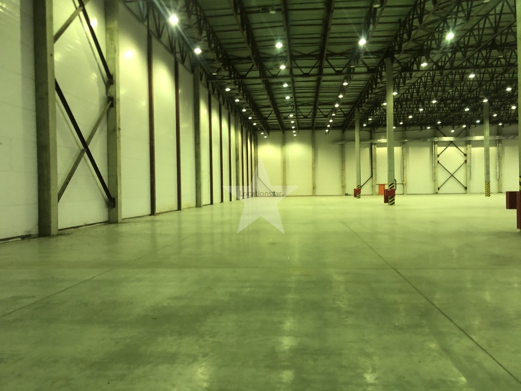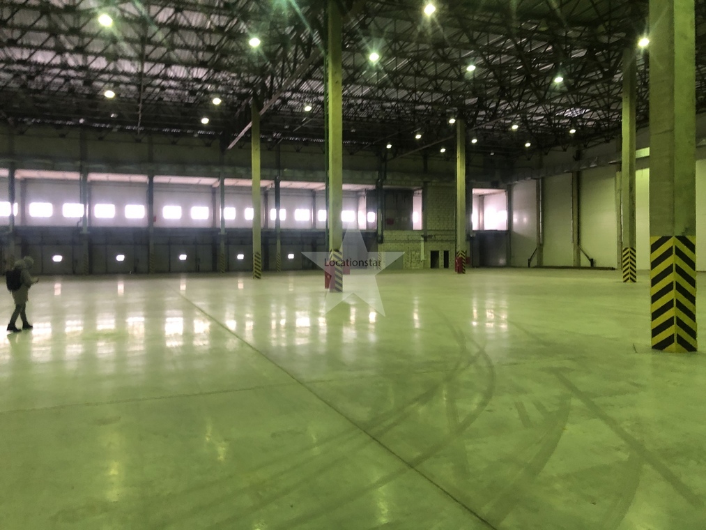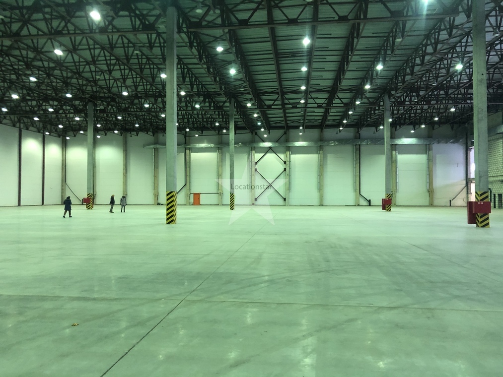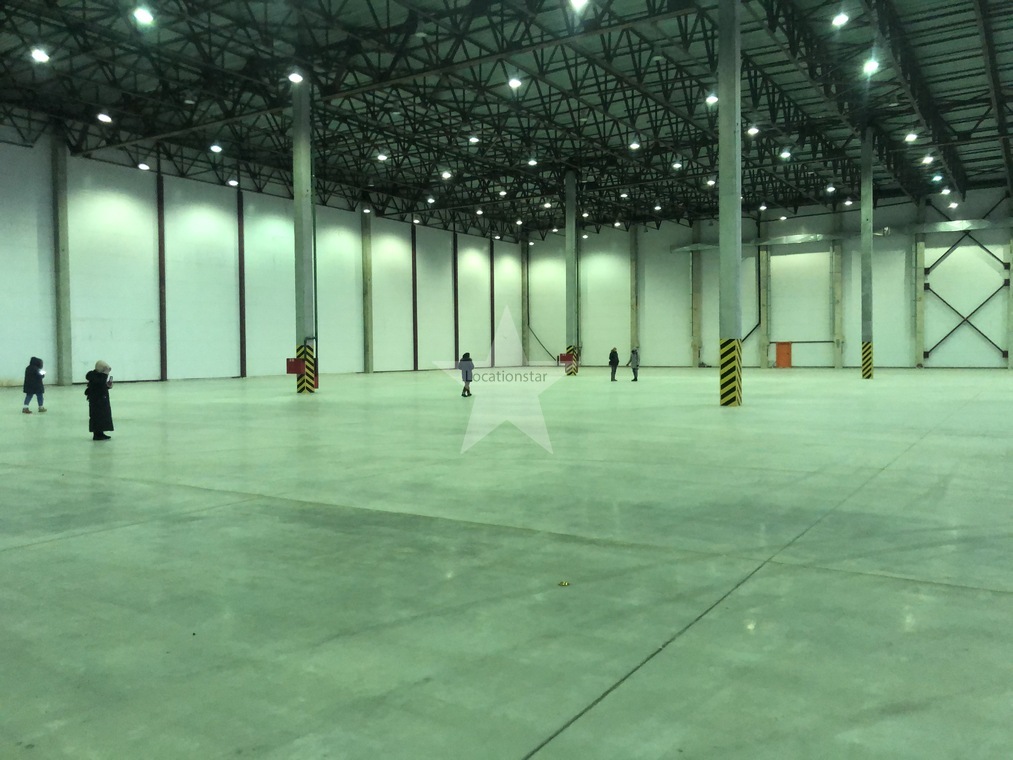 12.000кв.м, пол антипыль, высота до фермы 12,5м, конёк 14м, ширина длина - 110х85, шаг колон 24х12, 2-въезда с земли, под Еврофуру.