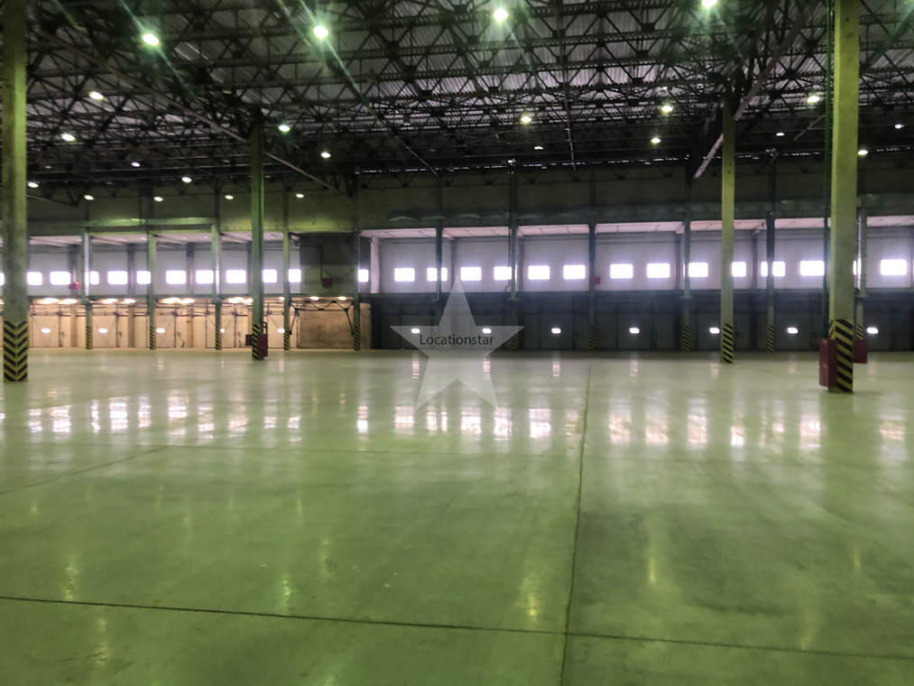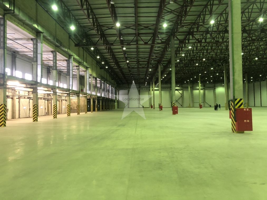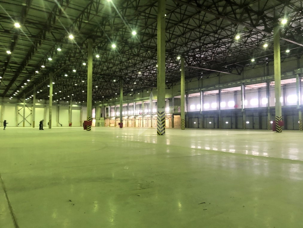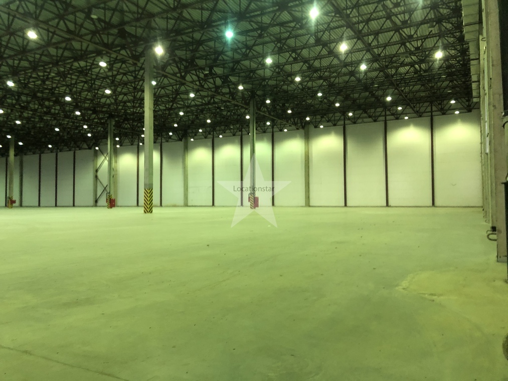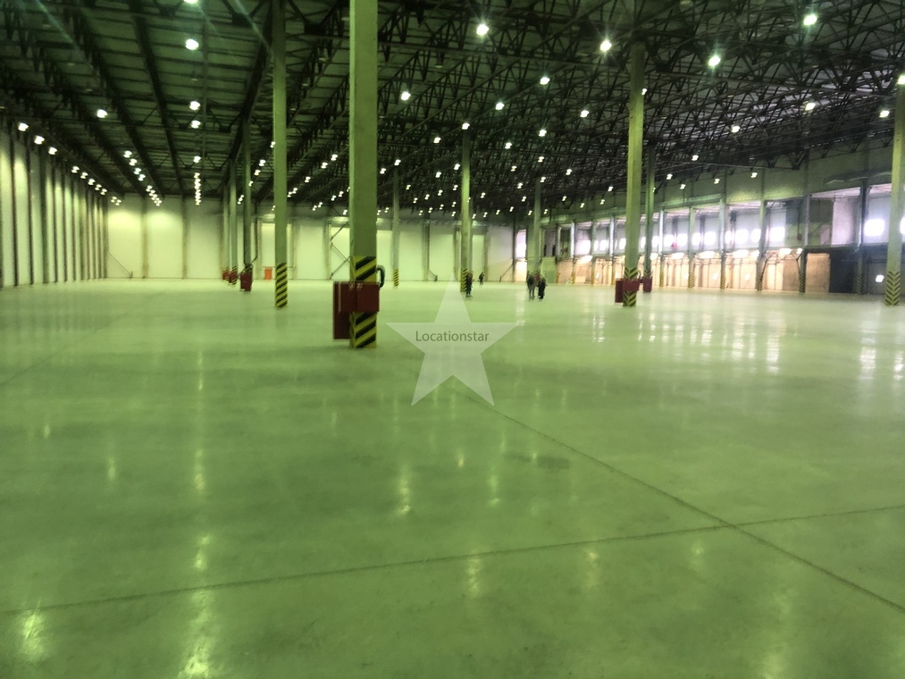 12.000кв.м, пол антипыль, высота до фермы 12,5м, конёк 14м, ширина длина - 110х85, шаг колон 24х12, 2-въезда с земли, под Еврофуру.