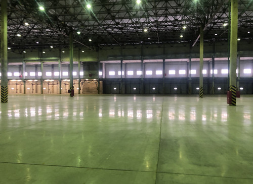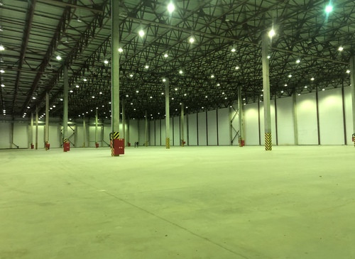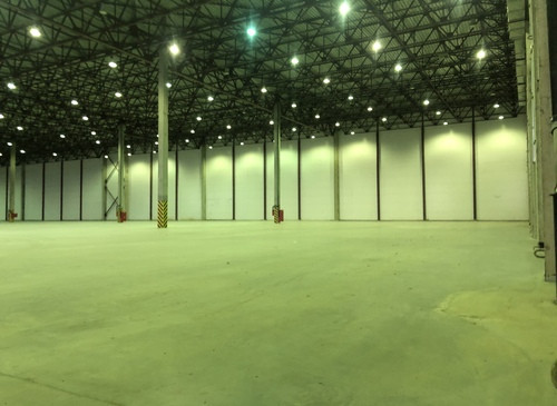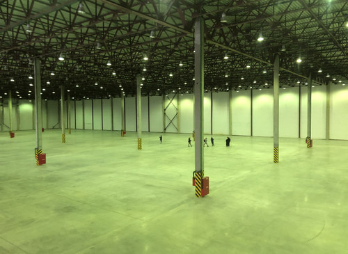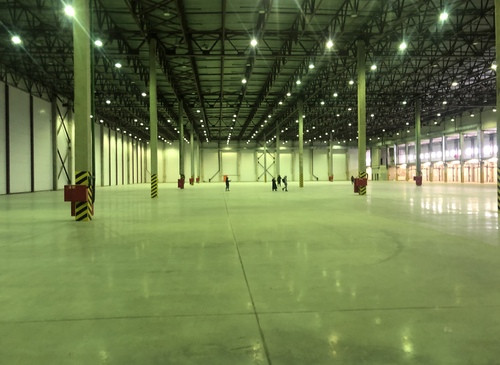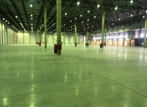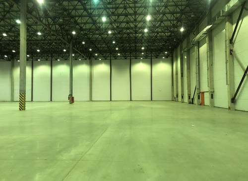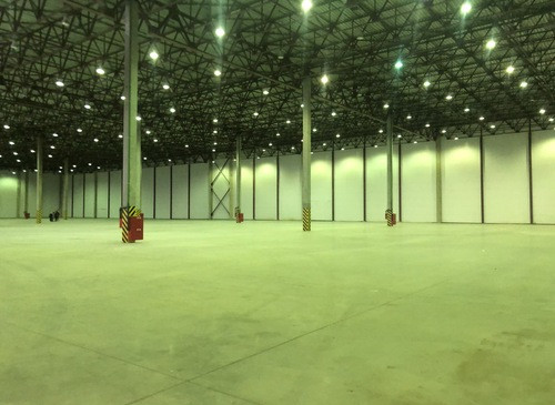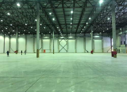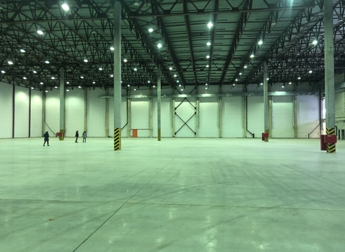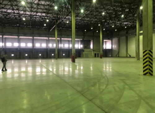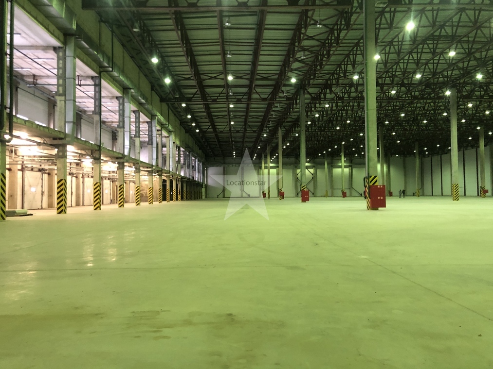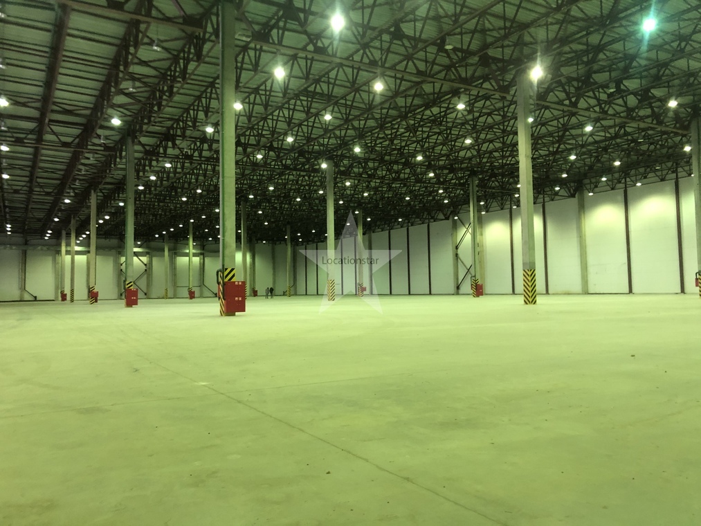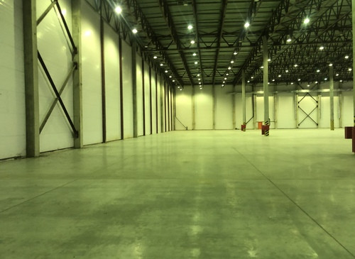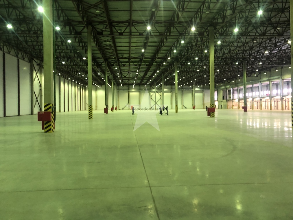 12.000кв.м, пол антипыль, высота до фермы 12,5м, конёк 14м, ширина длина - 110х85, шаг колон 24х12, 2-въезда с земли, под Еврофуру.